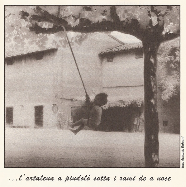L’artalena a pindoló sotta rami de a noce: sfiónghe da scontrasse che ronnole in volo! Singozzi d’aria e de vita e ‘ngroviji de luce. Un purcinello spaurito che pigolava da solo.